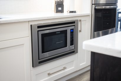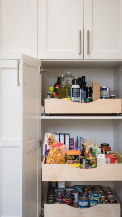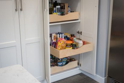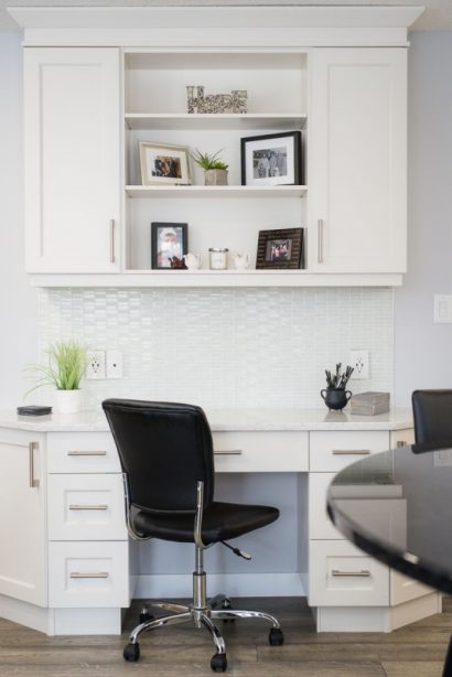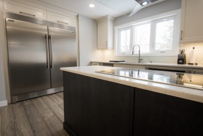 Background: Jacky and Derek have lived in the house since the early 90’s. The home included a typical oak trim package, and original kitchen that included an island with a raised eating bar. The sink was located in the island and the raised eating bar encroached on the counter space. This made for an awkward design and little space for meal prep.